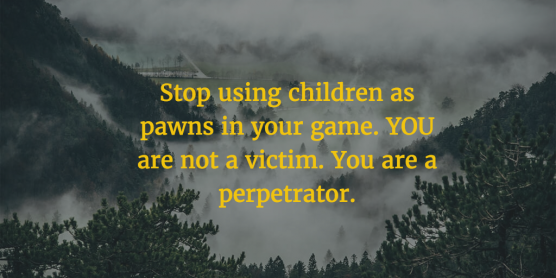 Stop using children as pawns in your game. YOU are not a victim. You are a perpetrator. The sooner you realize that the faster you can better yourself. Stop going back on your word over and over. Stop fighting in front of them. Stop whispering in their ears. Stop making pick-up and drop offs difficult. YOU are hurting them. YOU ALONE. Stop blaming everyone else for your actions. Take the opportunities you have been given to change yourself for them. Stop acting like a child and grow to help raise them. Stop creating drama where it isn’t needed. Stop texting all hours of the night. Build a relationship. Build trust. It is probably too late for you but in life I try to see the good and hope that one day something will click, you will see what you have done and that you can somehow repair it. Take what you have and make the most of it. Take the time you are allowed and prove yourself. Prove that you deserve more because right now you have been given more than you deserve.