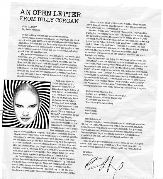 Seven years, seven months, and ten days ago, the clock struck midnight, 2000, and the world began turning faster. Back then, I disbanded the Smashing Pumpkins because the new millennium demanded it. A new age needed a new start—cleanliness and unity, not the confused, confusing wreck I let the band become.