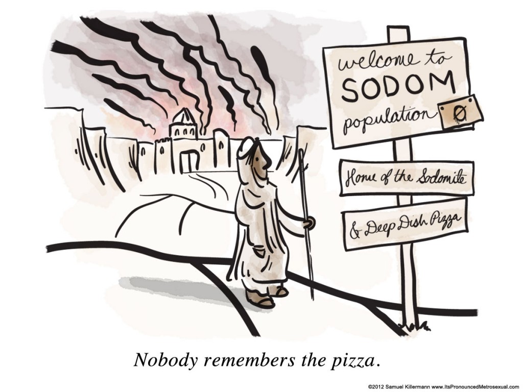 No, if I had to guess, I’d pin you down as a “Sodomite” guy. I mean to say I bet that’s the story you draw from when you preach the anti-gay Gospel. Sorry if you misunderstood. Is that it? That’s fair. It’s both a fun word (sometimes I yell it like Gandalf: “You shall not SODOMIZE”), and a commonly misunderstood story. I’m sure you know it (you’ve read the Bible, right?), but I’ll synopsize just in case.