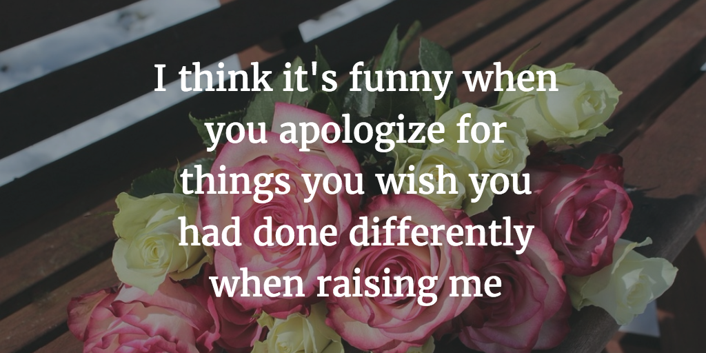 I think it's funny when you apologize for things you wish you had done differently when raising me. I shouldn't have to remind you that it's okay for making mistakes because you're human and I HOPE I can raise my children half as well as you did. When I look back on my childhood, I do not see your "mistakes." I see the countess smiles you put on my face, the hours you spent watching my sporting events, the amazing meals you cooked after coming home exhausted, and supporting me in everything I did.